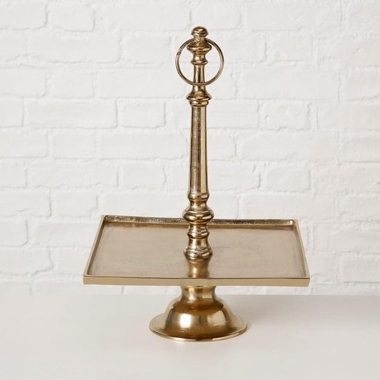 Deze gouden etagére is verkrijgbaar met een vierkant of rond plateau. Hij is gemaakt van aluminium en helemaal in het goud. Met de ring aan de bovenkant kan je hem makkelijk optillen. Hij is 50 cm hoog.