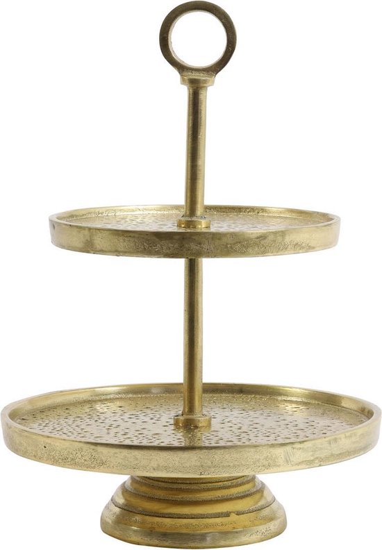 Een prachtige woonaccessoires of om hapjes te serveren. Waar je hem ook voor gebruikt, hij steelt de show. Het is een gouden etagère met ruwe afwerking. Hij heeft 2 ronde plateaus met diameter van 24 cm. Hij heeft een hoogte van 37 cm en weegt ongeveer 1,6 kg.
