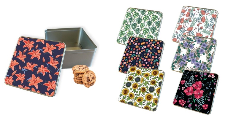 De laatste koekjestrommel is een mooie vierkante met een ruime inhoud. Bovendien is de koekjestrommel in 8 varianten te verkrijgen, van mooie zonnebloemen tot klaprozen en bladeren van de gatenplant.